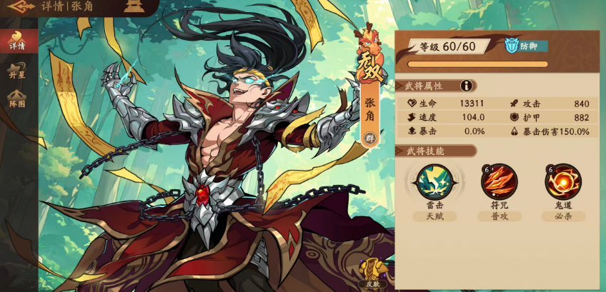 张角:雷属性核心武将,技能生效的前提是成功触发“闪”状态。达成条件后,有50%概率追加一次雷击伤害,伤害值为自身最大生命值的10%,上限不超过当前生命值的20%。该机制使其高度依赖操作环境及敌方控制抗性——一旦被控,闪无法触发,整体输出将大幅受限。