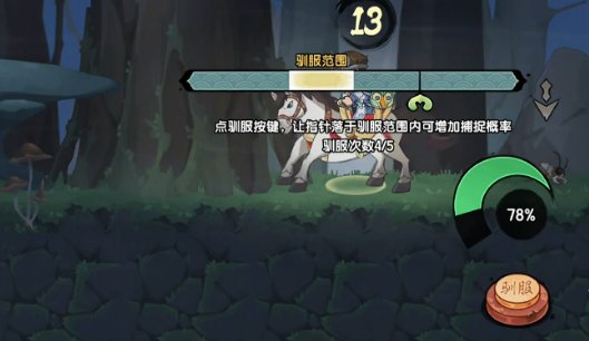 驯服灵兽的过程并非完全依赖运气,而是结合了操作技巧与策略准备的互动系统。当玩家进入森林场景并锁定想要驯服的目标灵兽时,驯服界面会自动弹出。界面中央会出现一条不断变化的进度条,上面的光标会按照固定节奏来回移动。玩家共有5次捕捉机会——当光标移动到高亮显示的"最佳区间"时,及时点击就能使本次驯服的成功率增加2%。如果5次都能准确命中这个区间,总成功率提升可达10%,这明显区别于不进行任何操作的玩家。