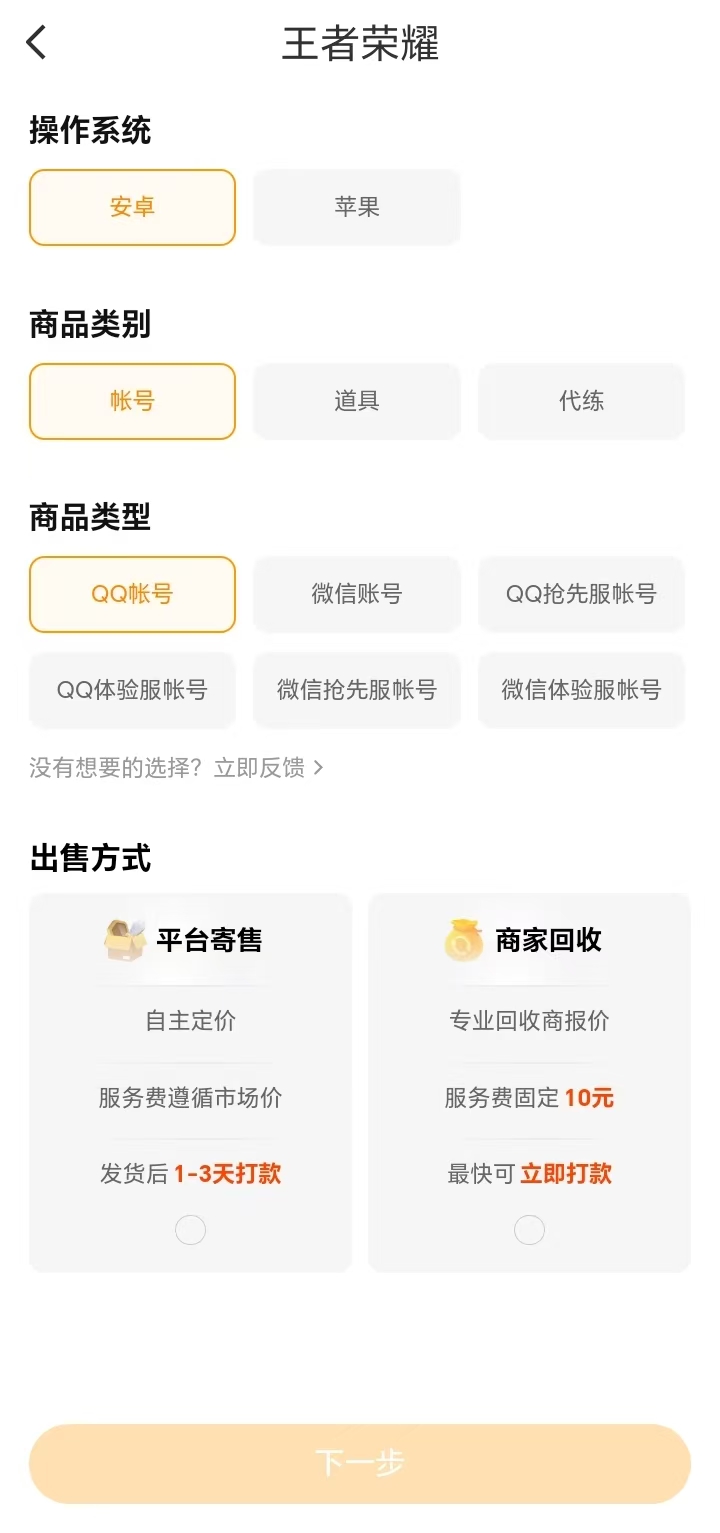 对于卖家来说,操作流程也十分便捷:只需在首页底部点击“卖账号”按钮,选择王者荣耀即可进入账号出售页面。在欢喜游,账号出售方式包含平台寄售和商家回收两种,最快可实现即时到款。
