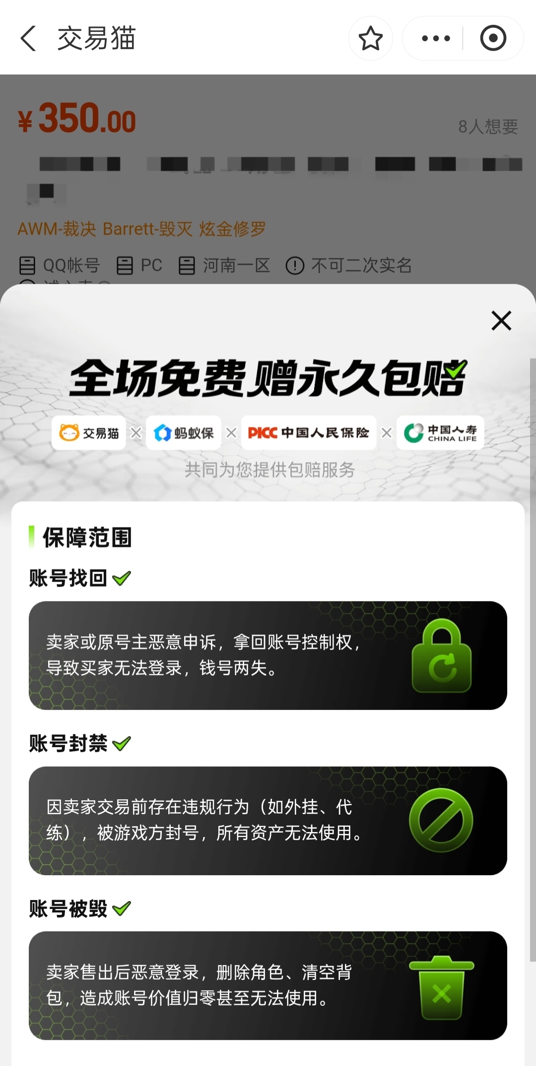 除了估值功能,平台最具吸引力的亮点在于其完善的安全保障机制。实际交易中,许多玩家担忧账号被找回、交易信息不实等问题。针对这些痛点,平台推出多重保障措施。例如,欢喜游平台设有“平台发货”机制,账号由平台接管,验号、换绑等中间环节均由平台完成,有效降低因描述不符引发的纠纷。同时,平台提供永久包赔服务,凡标注包赔的账号,若后续出现账号被找回、封禁等异常情况,平台将直接启动赔付流程。