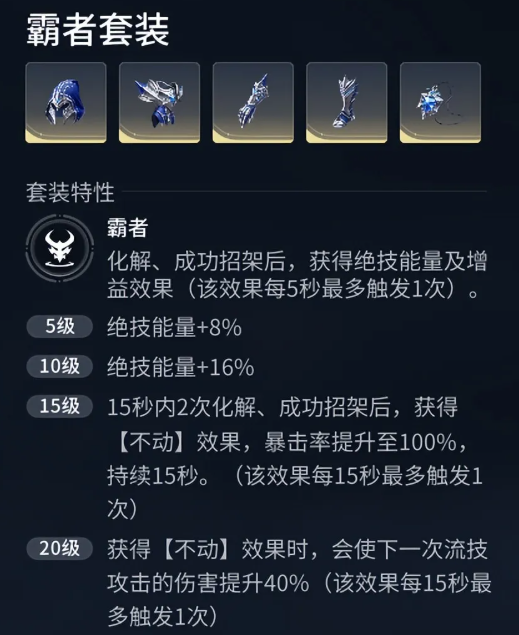 前期核心装选择“霸者重装”:提供240点物理防御、1200点最大生命值及被动“不屈意志”——每次成功招架后,立即回复2%最大生命值并获得10点绝技能量,显著缩短大招空档期。
