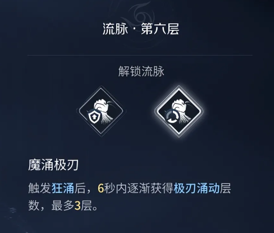 主推“魔涌动”与“极刃”双核心流脉:六层流脉选择“极刃涌动”,每层提升1层“极刃涌动”的获取效率,大幅压缩触发技积攒时间;十层流脉必选“极刃反击”,招架成功后获得持续5秒的“极刃增幅”效果,最多叠加3层,每层提升50%反击技伤害,三层满叠时反击技总伤害提升150%,实战中常用于反杀或收割残血。