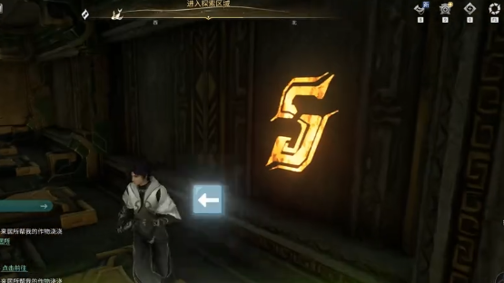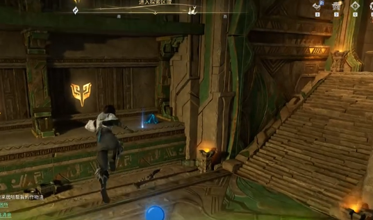 第一步:进入机关区域后,留意地面已激活的发光台阶,其上放置着一枚可交互的蓝色石块。靠近即可触发牵引机制,将其从初始位置平稳拖出。接着迅速转向对侧区域,在左侧第二块石板完成首次安放。此时,正对墙面会同步亮起一道光效,标志着第一阶段成功激活。