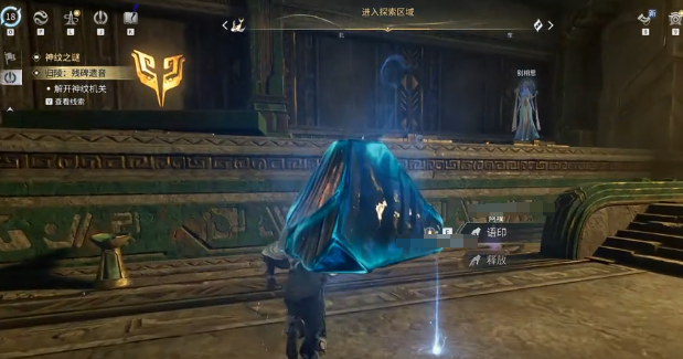 第二步:返回起点,启动钩锁功能,仰视上方角落锁定锚点,借此跃升至第二层平台。视野开阔后,可见另一枚待安置的蓝色石块。需将其牵引至左起第三块石板——该位置刻有竖向神纹标识,务必保证石块完全覆盖并贴合该纹样,落稳后墙面将再次响应亮起。