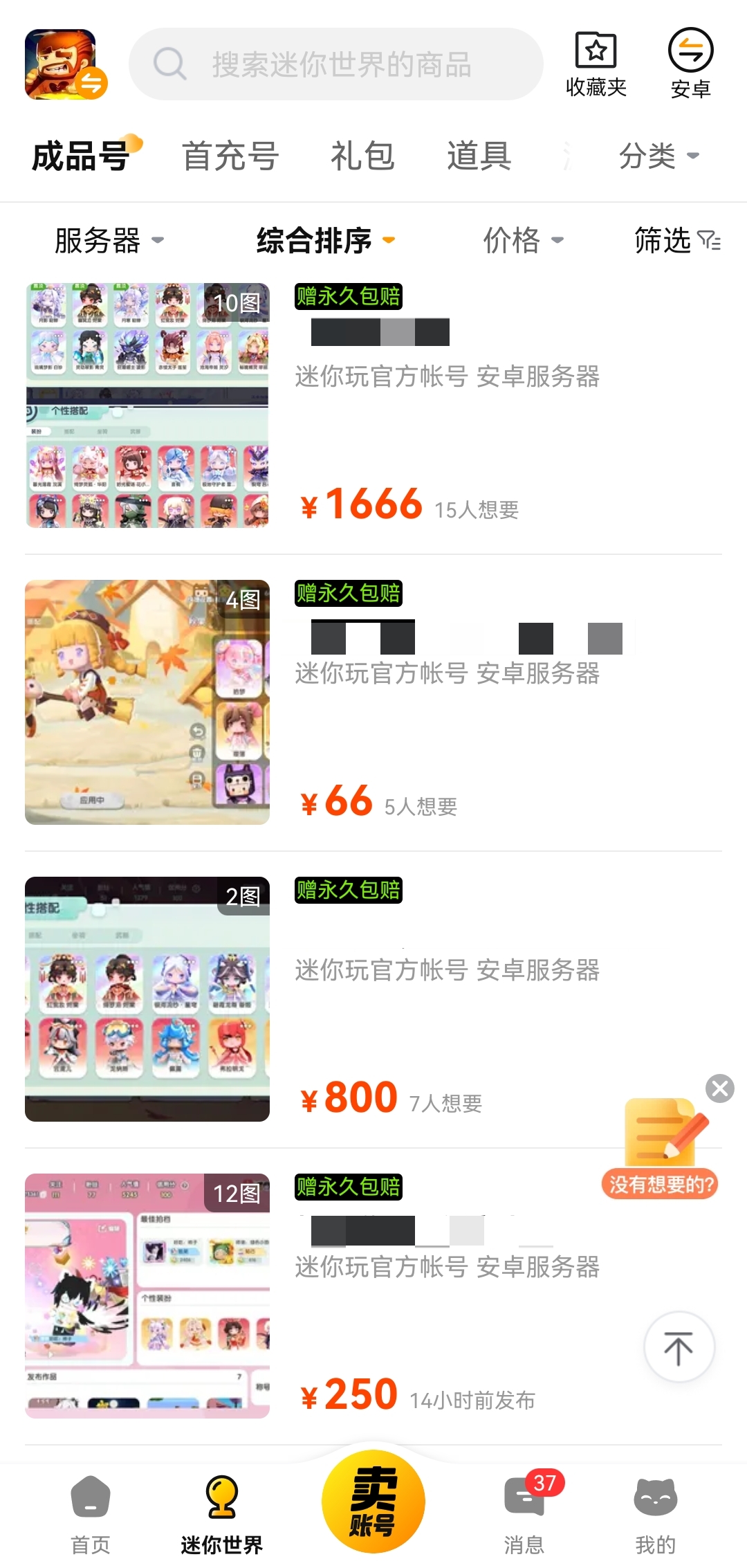 安卓用户直接点击上方链接即可下载欢喜游APP,iOS用户请访问欢喜游官方网站。进入后搜索"迷你世界",各类账号任君挑选。欢喜游实现了全游戏覆盖,平台接入了超过6000款热门游戏,上架商品数量多达100万件以上,多年来累计服务玩家已突破7000万大关——这意味着平台买家众多、账号流转迅速,全皮肤账号这类热门商品需求量大,好在货源充足,多浏览总能找到心仪的选择。