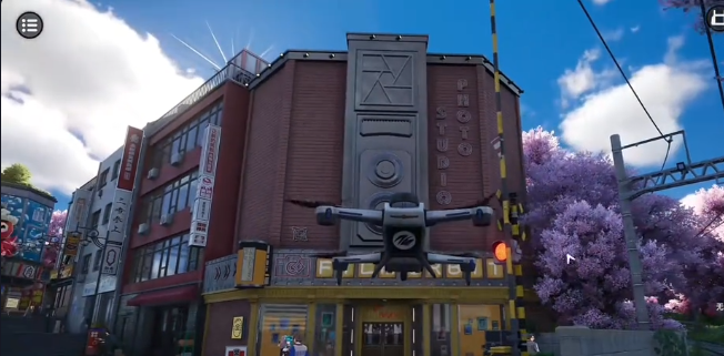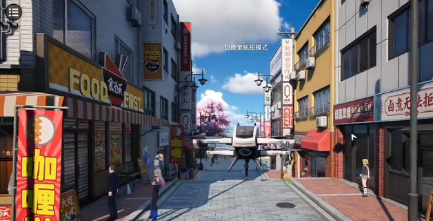 第一阶段拍摄需站在照相馆正门外侧,开启摄影模式并操控无人机,调整视角确保门楣、招牌及门框全部进入画面。第二阶段目标建筑位于照相馆右侧沿街区域,出门后沿右手边道路直行约三十步即可抵达,切换摄影模式后对准该建筑外立面完成取景。第三阶段仍从照相馆出发,沿相同路线前行至街角,可见一座风格化石雕,其基座旁站立两名NPC,其中一名正发放传单,此为指定拍摄对象,对焦锁定后即可提交。