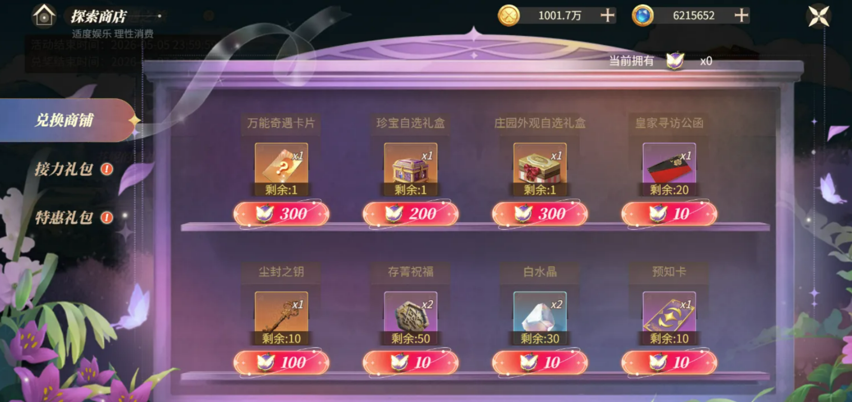 「探索商店」支持使用活动代币兑换万能奇遇卡片、珍宝自选礼盒及庄园外观自选礼盒,三类奖励均具实用价值,建议优先兑换稀缺资源。