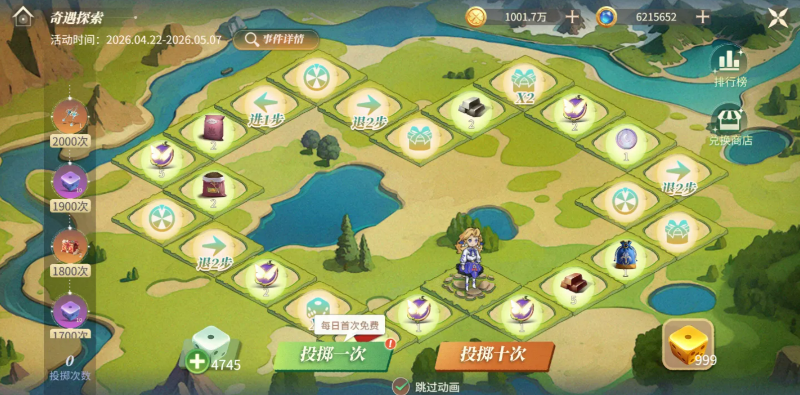 「奇遇探索」为本次活动核心玩法,采用棋盘式交互设计。玩家使用普通骰子投掷,控制芬妮按点数移动,落点格子触发不同事件:包括直接发放道具、随机礼盒、额外步数、转盘抽奖,以及“下次奖励翻倍”“下次投掷点数翻倍”等增益效果。每日享有1次免费投掷机会;幸运骰子支持指定点数,可通过接力礼包与奇遇基金获取。