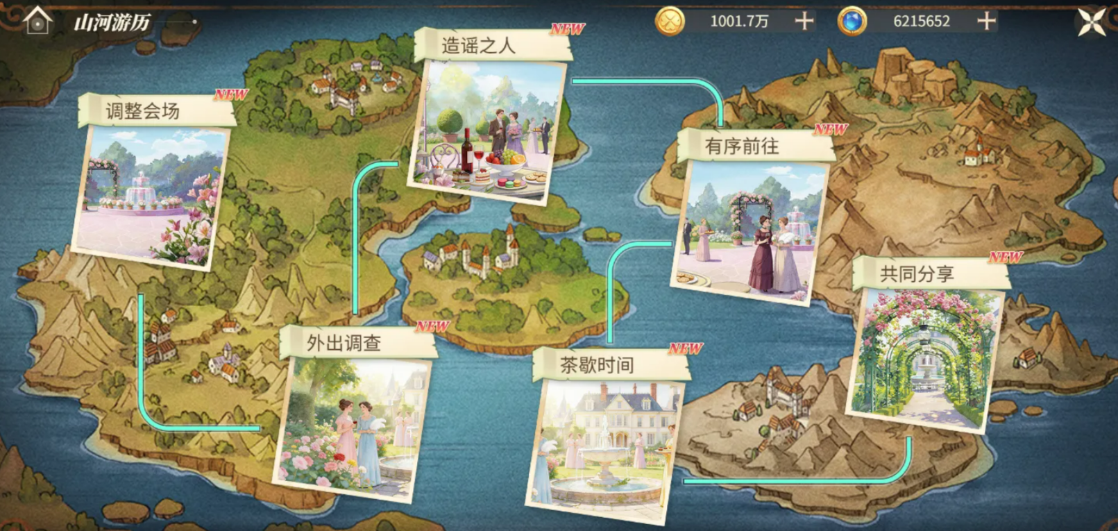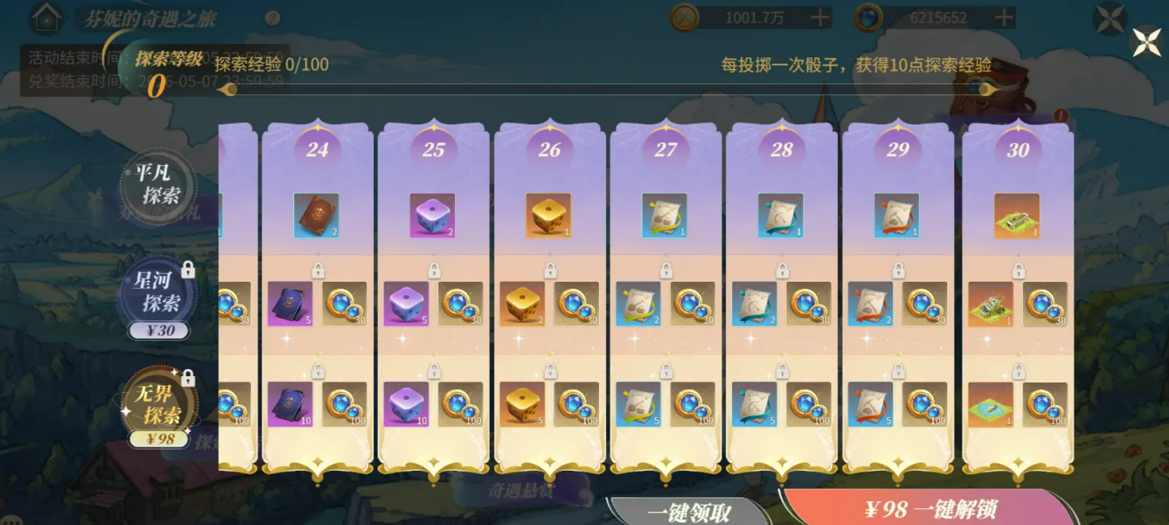 「山河游历」以剧情任务为主线,完成章节可获得普通骰子与钻石。该模块同步展开芬妮专属故事线,适合偏好叙事体验的玩家沉浸其中。「奇遇悬赏」为任务型玩法,通过完成指定目标获取骰子与钻石,悬赏列表支持刷新,高价值奖励可通过多次刷新争取。