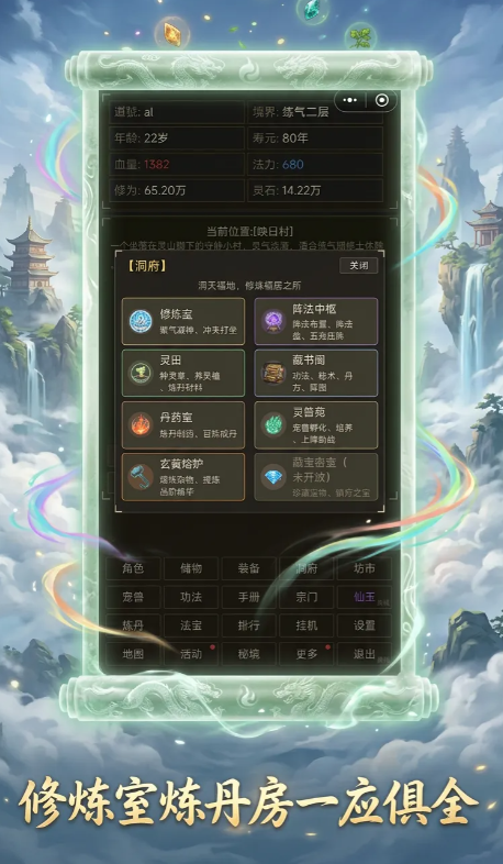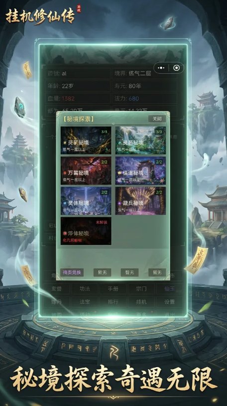 界面设计侧重极简文字交互,视觉风格清爽简约,操作逻辑简单易懂。为解决放置类游戏普遍存在的资源产出不均问题,游戏搭建了多层级收益结构:主线挂机、副本次元探索、宗门任务、秘境副本等均能持续产出灵石、灵草、精魄、器胚等基础资源;同时离线状态下收益无衰减,让玩家真正体验到“挂机即有收获”的轻松游戏节奏。