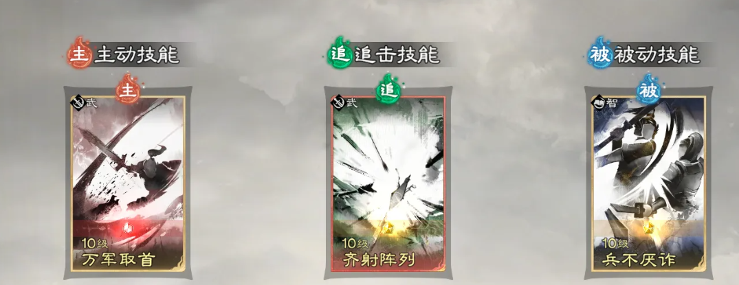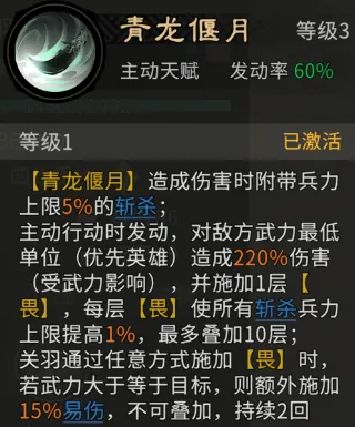 我们逐一解析三人的核心机制。关羽天赋【青龙偃月】为可主动释放技能,基础伤害倍率为220%,优先锁定敌方武力值最低目标并附加【畏】状态。每次命中后,自身兵力斩杀阈值提升1%(受【畏】层数影响),最高叠加10层。若关羽武力值不低于目标,则额外附加持续两回合的15%易伤效果。