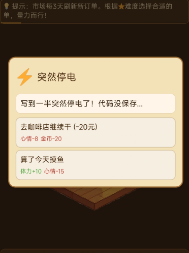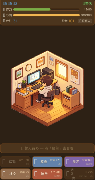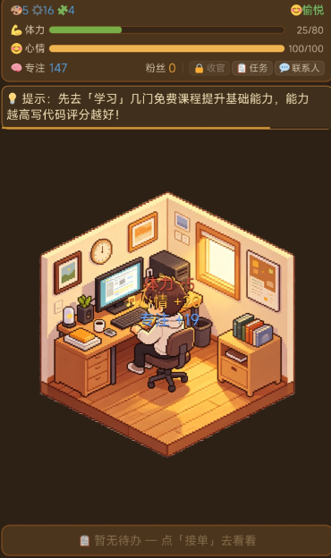 本作以"真实外包工作流程"为设计核心,打造沉浸式开发者成长系统。起步阶段,玩家仅配备基础设备与基础技能,在狭小工作间中接单编程;随着项目完成、收入增加与技术树解锁,可逐步更新电脑配置、改善工作环境、扩展人脉网络,并掌握如全栈开发、AI模型调优等高级技能,完整重现自由职业者从新手到专家的成长轨迹。