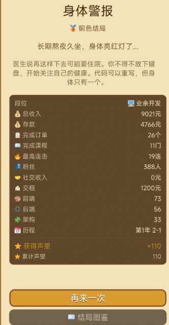结局体系采用多分支设计,包含健康风险类(如长期伏案工作引发健康警报)、行业影响力类(如粉丝量暴涨后获得顶尖科技公司邀请)、开源贡献类(如主导知名项目孵化)等多种可能性。最终能否达成"财务自由"的最高成就,取决于玩家在时间管理、健康保护、技术投入与商业决策等方面的综合表现。