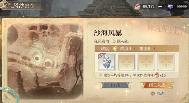 "风沙密令"为挑战型副本玩法,设置多档难度等级。通关任意难度后支持一键扫荡,显著提升资源获取效率。每次挑战成功均可获得黄金货币,难度越高,单次收益越丰厚。所获货币统一用于"琥珀商路"兑换系统,其中包含老荷兰颜料、活动限定Q版画灵等多类热门奖励,玩家可根据喜好自由选择兑换策略。