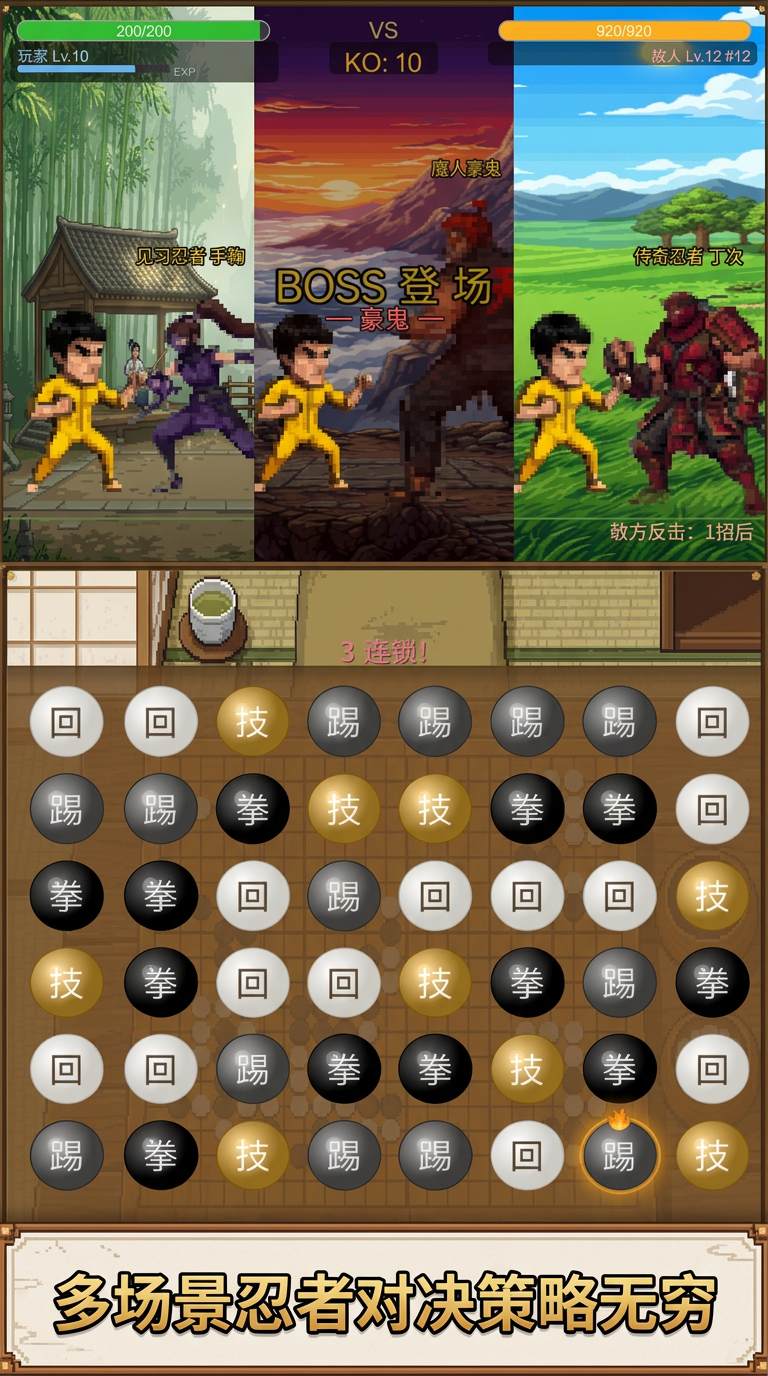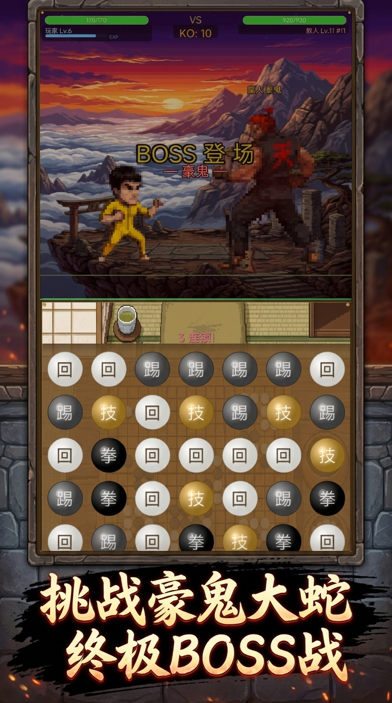 产品体验坚持"纯净对战"理念:完全没有插屏广告、激励视频复活或付费续关选项。失败后只显示结算信息,如KO数量、最高连击数、总伤害值,避免干扰性的商业化内容。美术风格与题材高度契合,背景场景根据对手身份实时变化——面对隐士高人时展现水墨远山和竹篱茅舍,对阵魔教护法时则变为赤焰翻涌、岩浆奔流的火山秘境,沉浸感强烈。