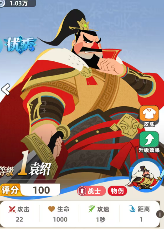 袁绍的基础属性更偏向功能性:定位为近战,攻速与攻击距离均处于蓝卡平均水平,但初始攻击力仅22点,难以承担主C职责。其真正优势在于天赋机制——初始便具备为全体友方单位提供+20%物理伤害的光环效果。该增益精准契合以战士职业为主的阵容需求,因游戏中多数物理输出源于战士职业,而法师、射手等职业更依赖法术强度或攻速类增益,袁绍的增益因此具备高度适配性。