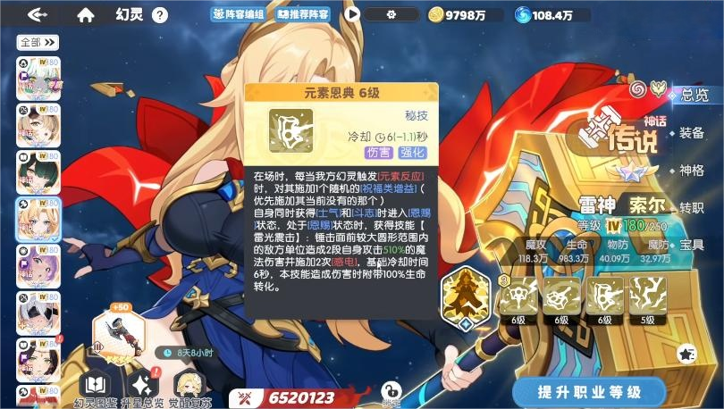 秘技“元素恩典”进一步巩固其在元素队中的核心枢纽地位:触发任意元素反应后,随机为友方单位赋予祝福类增益效果;释放“雷光震击”时,同步造成大范围伤害并附加感电状态,同时附带100%生命值转化的持续伤害效果,形成稳定的多段压制节奏。