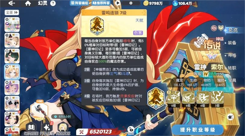 天赋技能“雷鸣连锁”为核心机制之一:每当对敌方单位施加感电状态时,自动叠加一层雷霆印记;叠满五层后触发爆炸,造成高额范围伤害。该技能建议提升至满级以获取最大收益。主动技能“神锤贯击”拥有稳定眩晕效果,命中后不仅提升士气与斗志属性,每次叠加印记还可获得基于最大生命值的护盾;且在元素编队中仍能正常触发印记积累机制。
