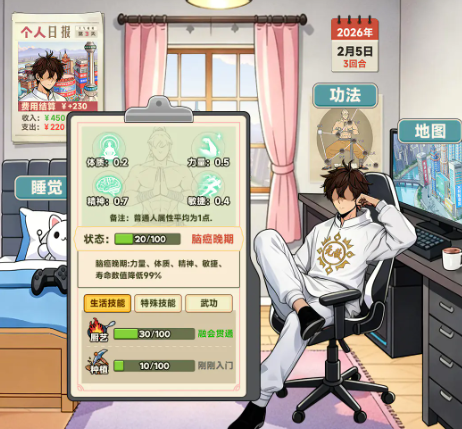 本作采用高度沉浸式的模拟成长框架,世界观建立在现代都市背景下的异能进化体系。玩家将扮演一名刚步入社会的普通人,所有日常活动——如通勤、锻炼、学习、工作——都会转化为直观可见的属性增长反馈。每次行动所消耗的体力和时间,都将具体化为力量、敏捷、精神、悟性等维度的数值提升,逐步实现从平凡到非凡的蜕变过程。