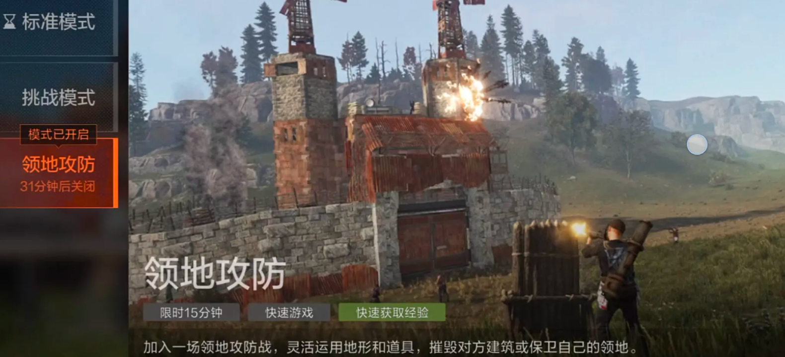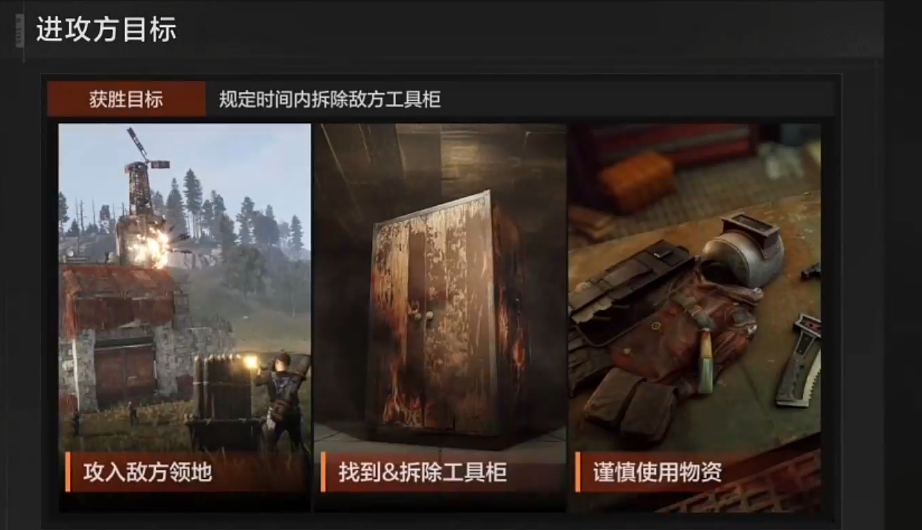 每场战斗将玩家随机分配为进攻方与防守方两大阵营。进攻方需要在15分钟倒计时结束前突破敌方防线,找到并摧毁其领地内的"工具柜";防守方则需借助地形和设施,全力保护该目标不被破坏。开局时,双方都会获得基础配置:一把连发步枪、一具火箭筒、若干投掷道具(如手雷、烟雾弹)以及基础医疗用品。