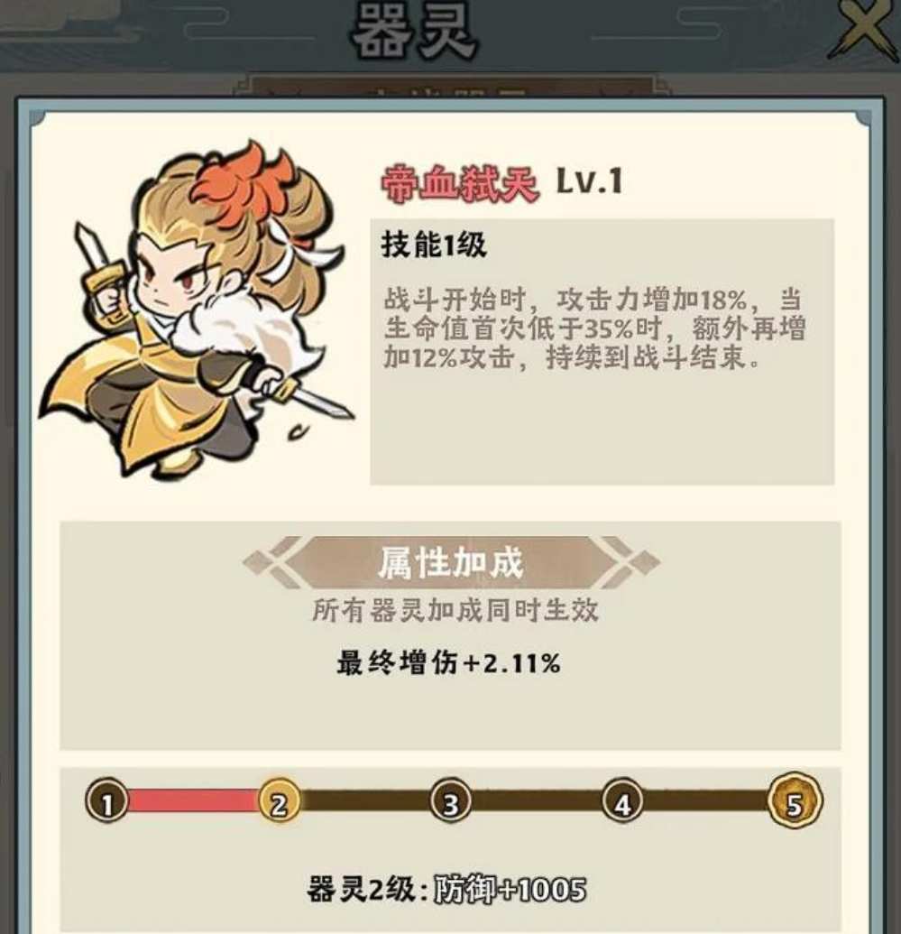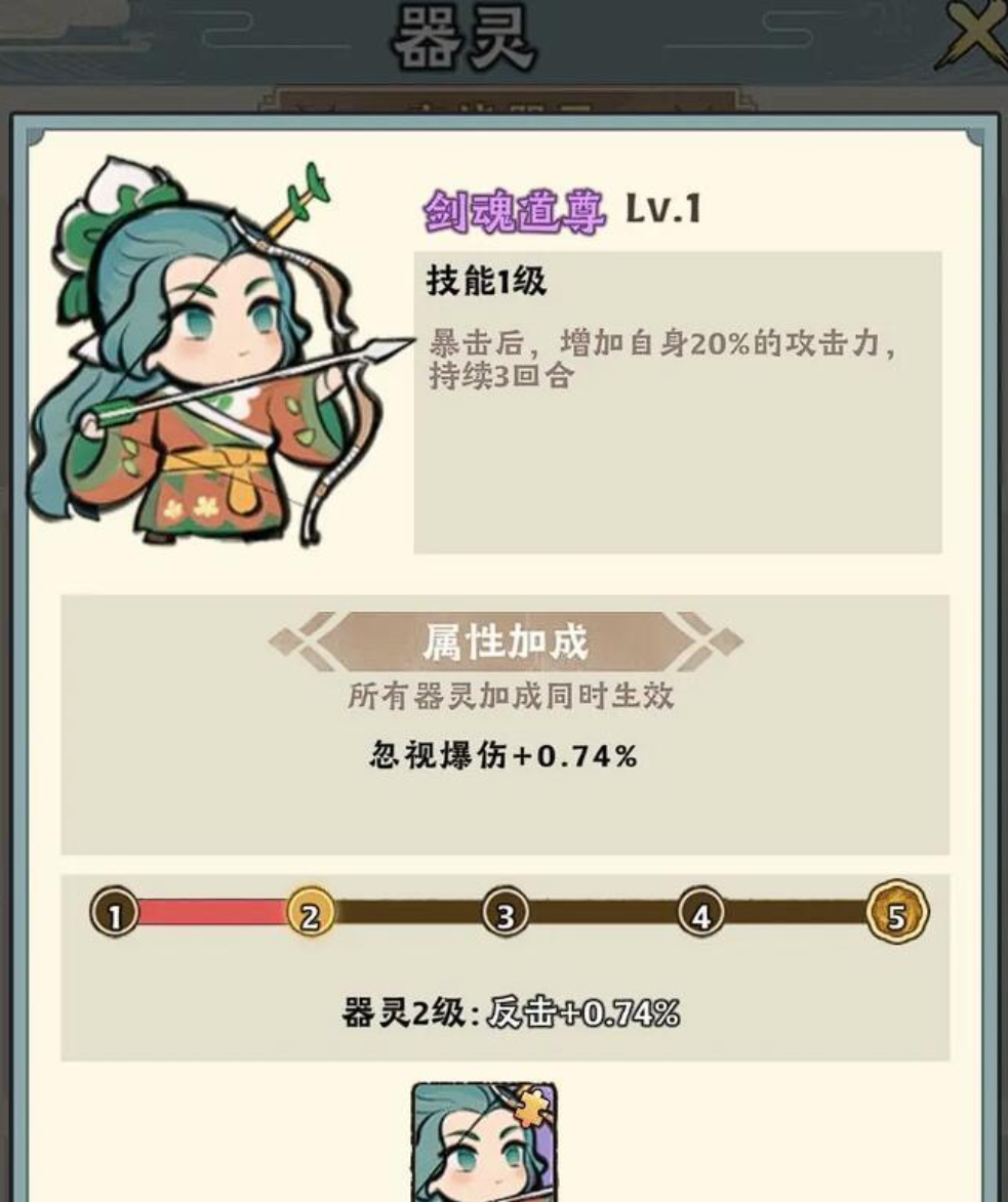 剑魂道尊是新手阶段最容易获取的高性价比器灵之一,只需通关主线第五章并完成相应器灵觉醒任务即可获得。其形象为一位持弓凝神的小仙女,技能机制围绕暴击触发设计:每次造成暴击时,自身攻击力提升20%,持续3回合。该效果具备优秀的叠加性与稳定性,在面对多目标敌人时尤为出色——例如清理野外密集刷新的低阶野怪、快速推进日常清剿任务等场景下,能显著缩短单场战斗耗时,大幅提升刷图效率。