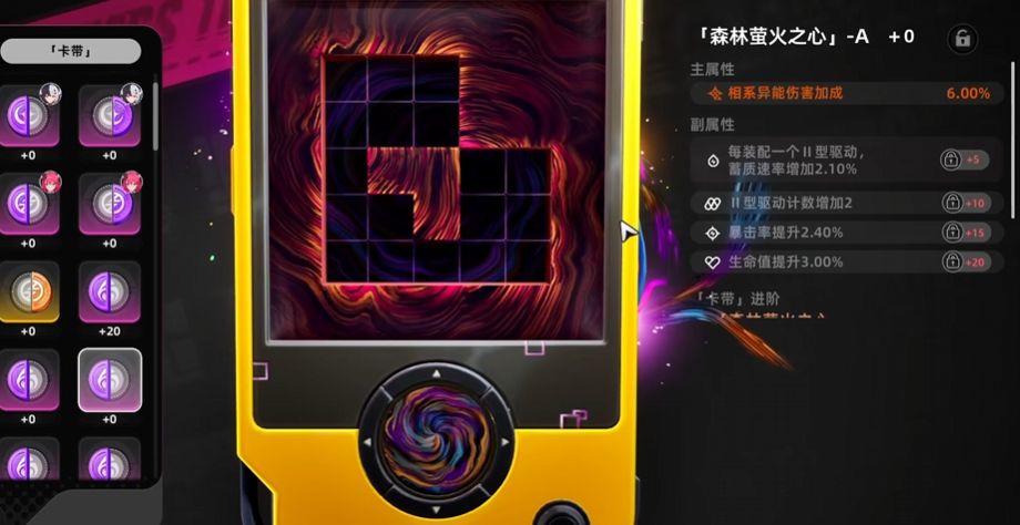 驱动块填满全部格子后,主要作用在于扩展并强化空幕的副属性维度。值得注意的是:驱动块需精准定位至能承接卡带加成的位置,其数值增益并非独立生效,而是依赖与卡带的协同匹配。空幕初始仅开放主属性,副属性需通过升级至指定等级后逐步解锁,不可跳过前置条件。