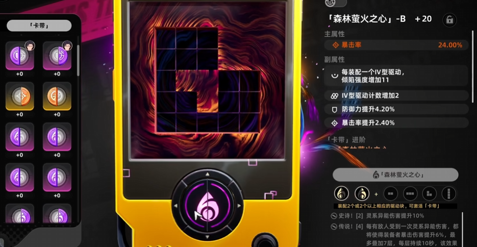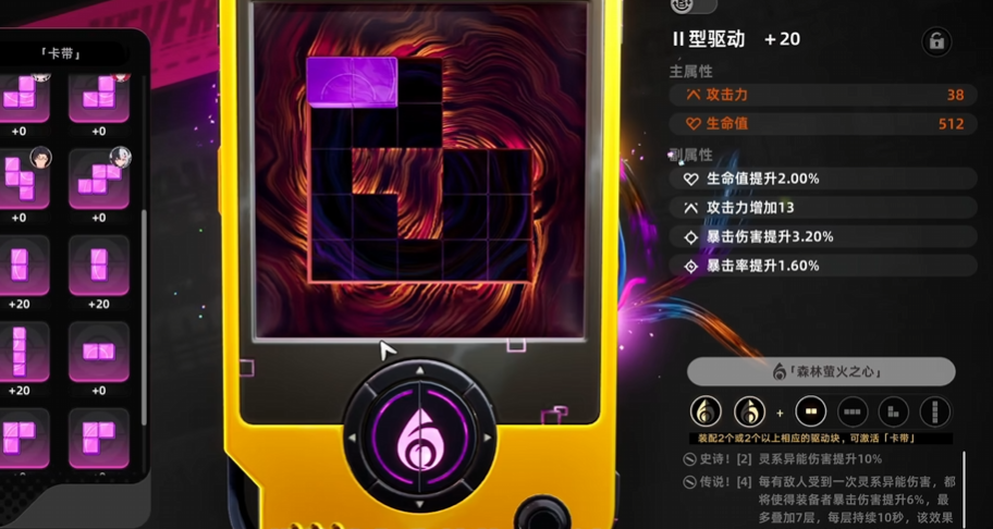 卡带装配完成后,界面右下角将呈现类俄罗斯方块的网格布局。除左右卡带外,还需在右侧四个固定位置嵌入"驱动块"——即上半区域组件。驱动块的种类、数量及排列方式,必须严格符合当前卡带所要求的套装条件,否则无法点亮套装状态。