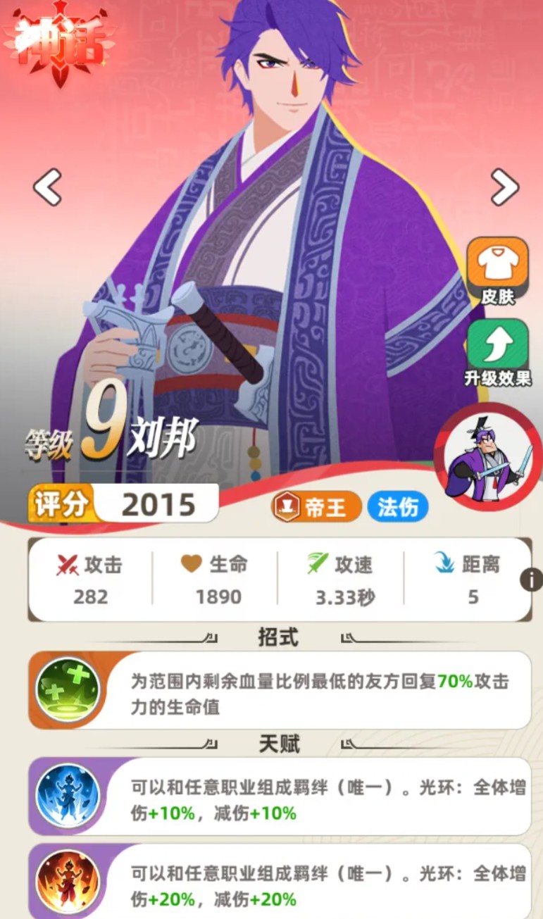 辅助位首选刘邦——该英雄在达到6000杯时解锁。其核心优势在于9级质变:无论搭配何种阵容体系,均可为全队提供增益效果,包括提升全队输出、降低所受伤害,并在战斗中持续为队友回复生命值。该特性使其在日常匹配、限时活动及高难度副本中都具有广泛的适用性。建议解锁后优先投入资源将其升到9级,后续再根据需求提升。