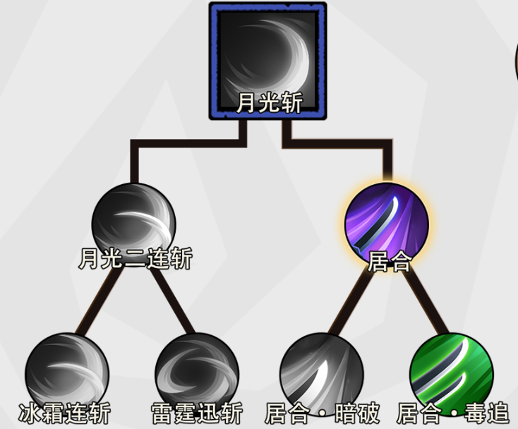 加点应围绕核心循环构建:优先解锁【月光斩】,随后依次激活其分支技能【居合】与【居合毒追】。其余非关联输出技能建议暂缓资源投入,确保关键技能等级达标,避免技能点分散导致循环中断。