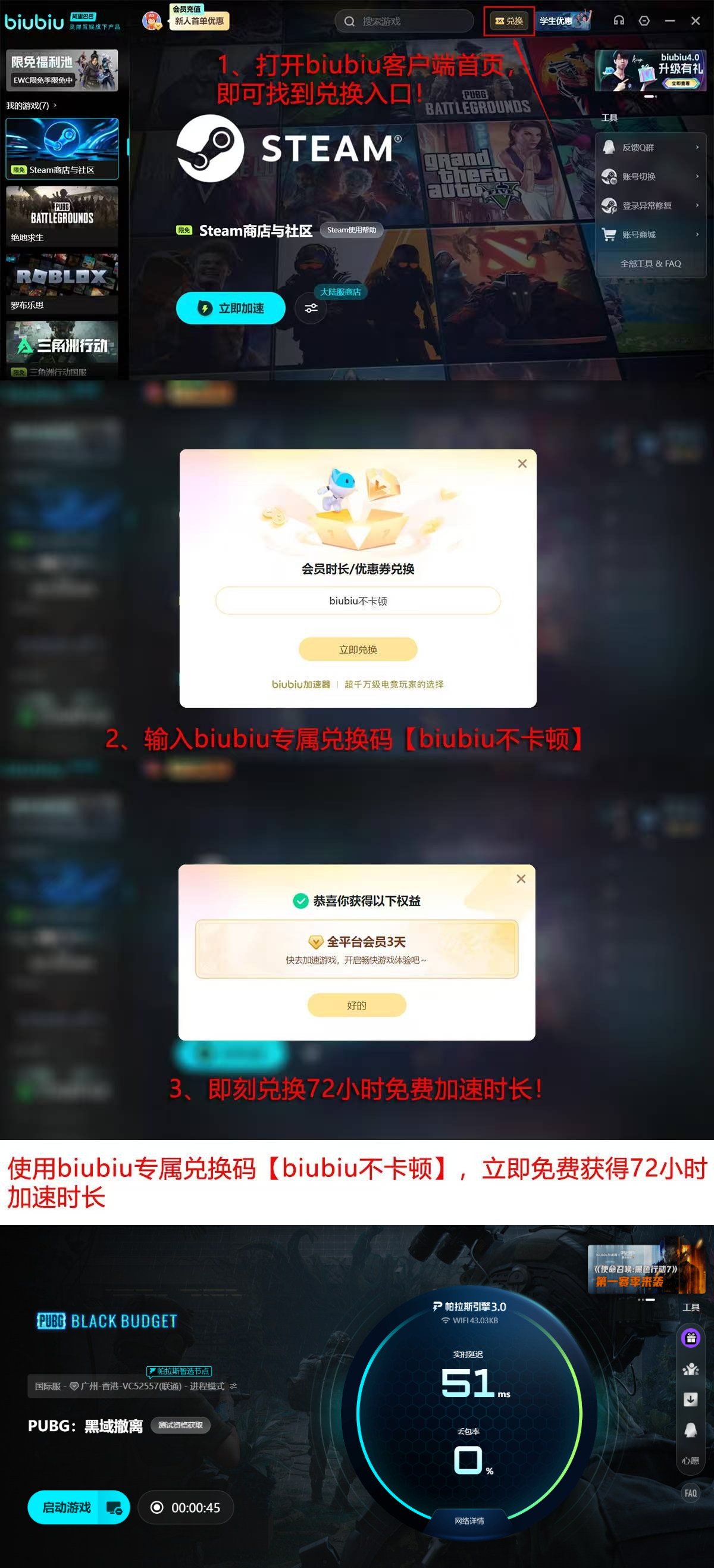 当前正值新版biubiu加速器全面启用时期。用户可通过平台内指定活动参与资格抽取,降低体验门槛。新注册用户可立即获赠24小时免费加速服务,并支持使用口令【biubiu不卡顿】额外激活72小时连续使用权,两项权益叠加后,新用户最高可获得96小时的高品质加速保障。
