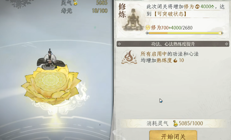 闭关过程将同步消耗角色寿元。因此,寿元上限成为制约修炼节奏的硬性边界。若寿元耗尽而精元仍未满,则角色将陷入修炼停滞状态,不仅无法推进境界,连基础属性成长也将中断。为规避此风险,需同步关注三项数值:当前精元存量、演化所需时间成本、剩余寿元总量。前期可通过系统任务奖励获取寿元丹,作为寿元补充的重要来源。