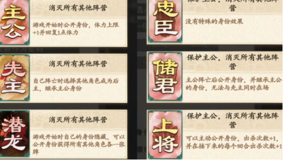 在主忠阵营中,共设8类身份,核心目标为清除所有非本阵营角色。主公作为阵营核心,开局即公开身份,虽无突出输出能力,但其存续直接关系整局胜负——若主公阵亡且未触发继承机制,主忠方便宣告失败。民主身份与主公形成协同,每回合可查验一名玩家的身份牌,为团队提供关键情报支持;先主则具备身份转接权:当主公出局后,可指定任意一名存活角色晋升为“后主”,使其立即变更阵营归属并激活新技能体系。
