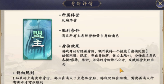 反贼阵营配置4种身份,核心任务为歼灭全部主忠阵营角色。反贼身份始终隐匿,成功击败一名反贼角色后,攻击方可额外摸取三张牌。盟主亮出身份后,自身体力上限+1,并强制其余所有角色执行摸牌动作;军师身份亦为隐藏,拥有“锚定天下”技能,亮明身份时可随机获得三张战法牌;先锋同样处于隐匿状态,亮明身份后可与任意一名玩家交换场上位置。