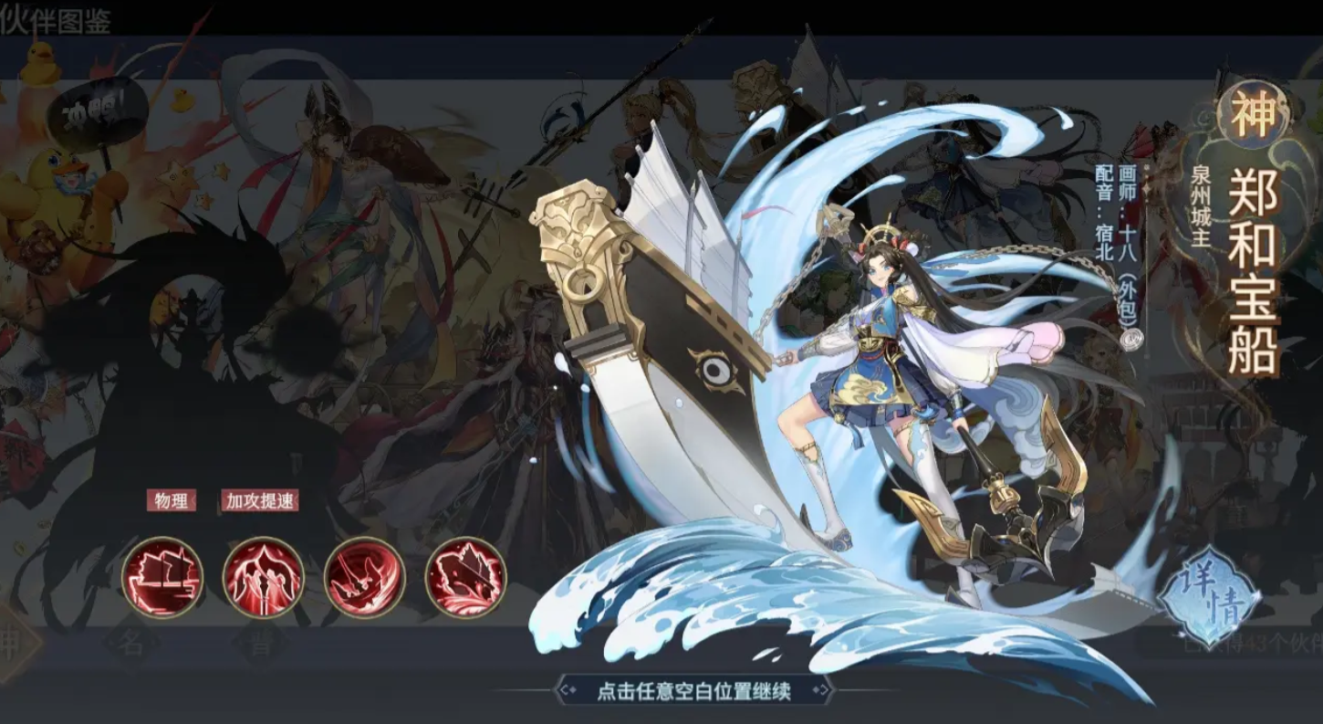 郑和宝船主打高机动协同作战风格,其被动技能可为全队提供移速增益,主动技能可在高速位移过程中连续发动多次突刺攻击,对密集小怪群具备极强的清场效率。操作风格偏向灵活走位的玩家,在匹配赛与限时挑战中常作为节奏发起者使用。