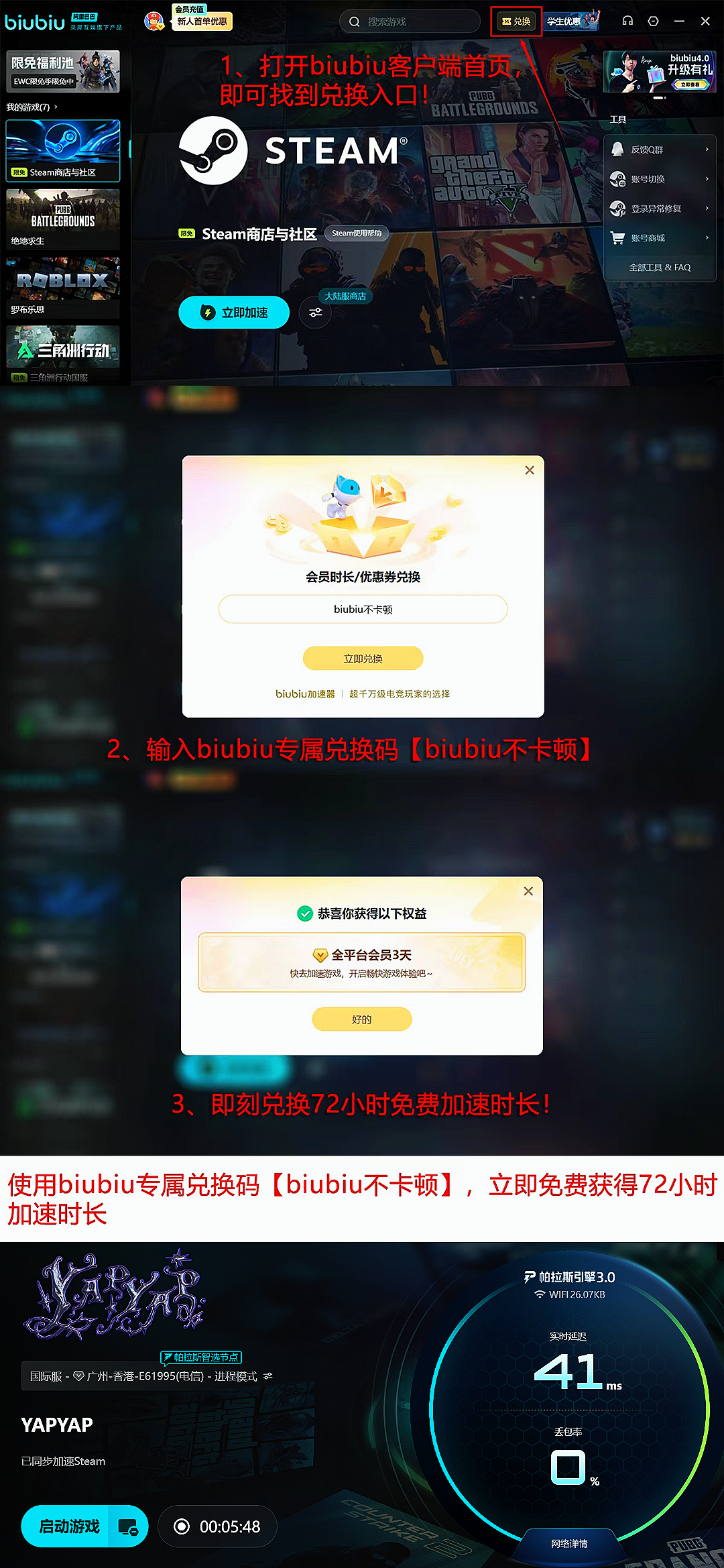 新用户完成注册后可以立即获得24小时全游戏通用加速时长;另外提供专属兑换码【biubiu不卡顿】,新老用户都可以额外领取3天加速权益。两项福利叠加后,新用户最高可获得96小时免费加速服务。