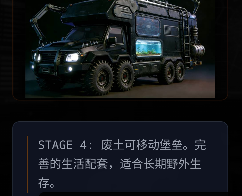 车辆改造系统是本作的核心特色之一。初始载具设定为基础款皮卡,玩家可逐步加装或升级撞角以强化近战防御能力,铺设太阳能电池板构建可持续的能源供应体系,并搭建水培种植舱实现食物的自给自足。该系统融合工程逻辑与策略规划元素,着重考验玩家在资源有限条件下的空间规划能力与功能适配思维。