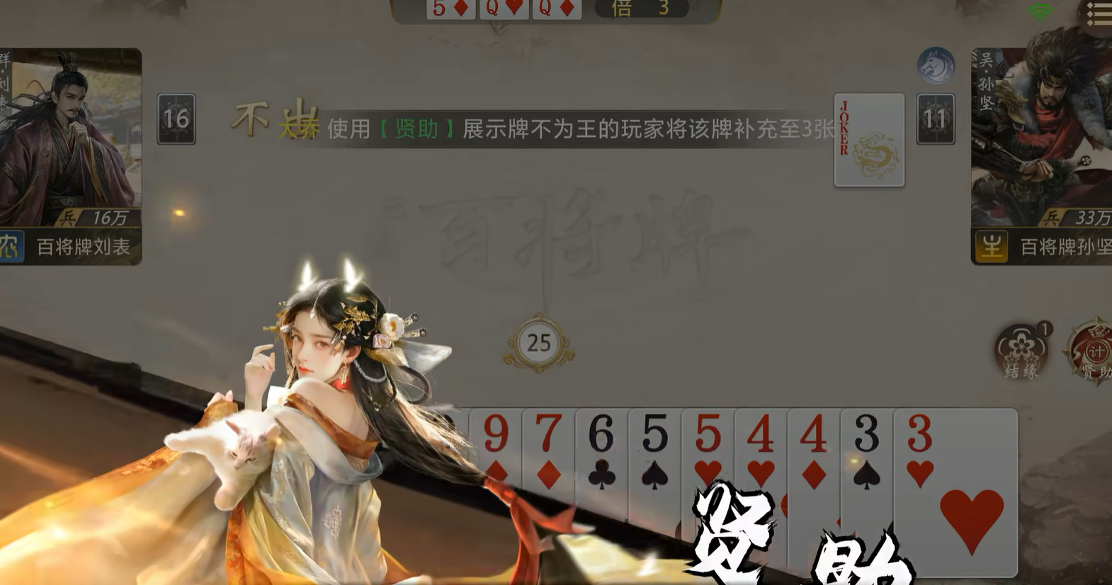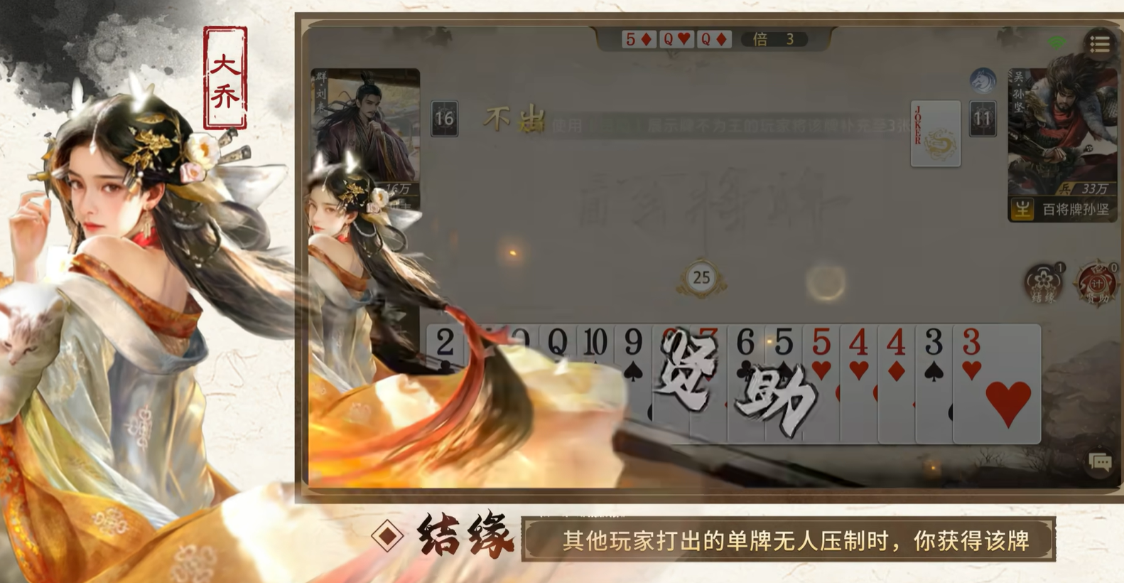 大乔具备两项核心技能:【结缘】与【贤助】。【结缘】可在敌方打出未被压制的单张牌时触发,自动回收该牌至手牌,形成可靠的牌型储备通道;【贤助】则允许她主动选择一名玩家进行比牌,若己方手牌点数不小于对方最大手牌,则可从牌库中抽取三张牌加入手牌——该效果既可用于自身构建高点数组合(如2、A级牌型),亦可针对性补牌强化队友出牌强度。在对局节奏把控上,大乔擅长以试探性出牌诱使对手展露关键牌序,并借补牌机制调控回合进程,践行“以智代力”的战术理念。