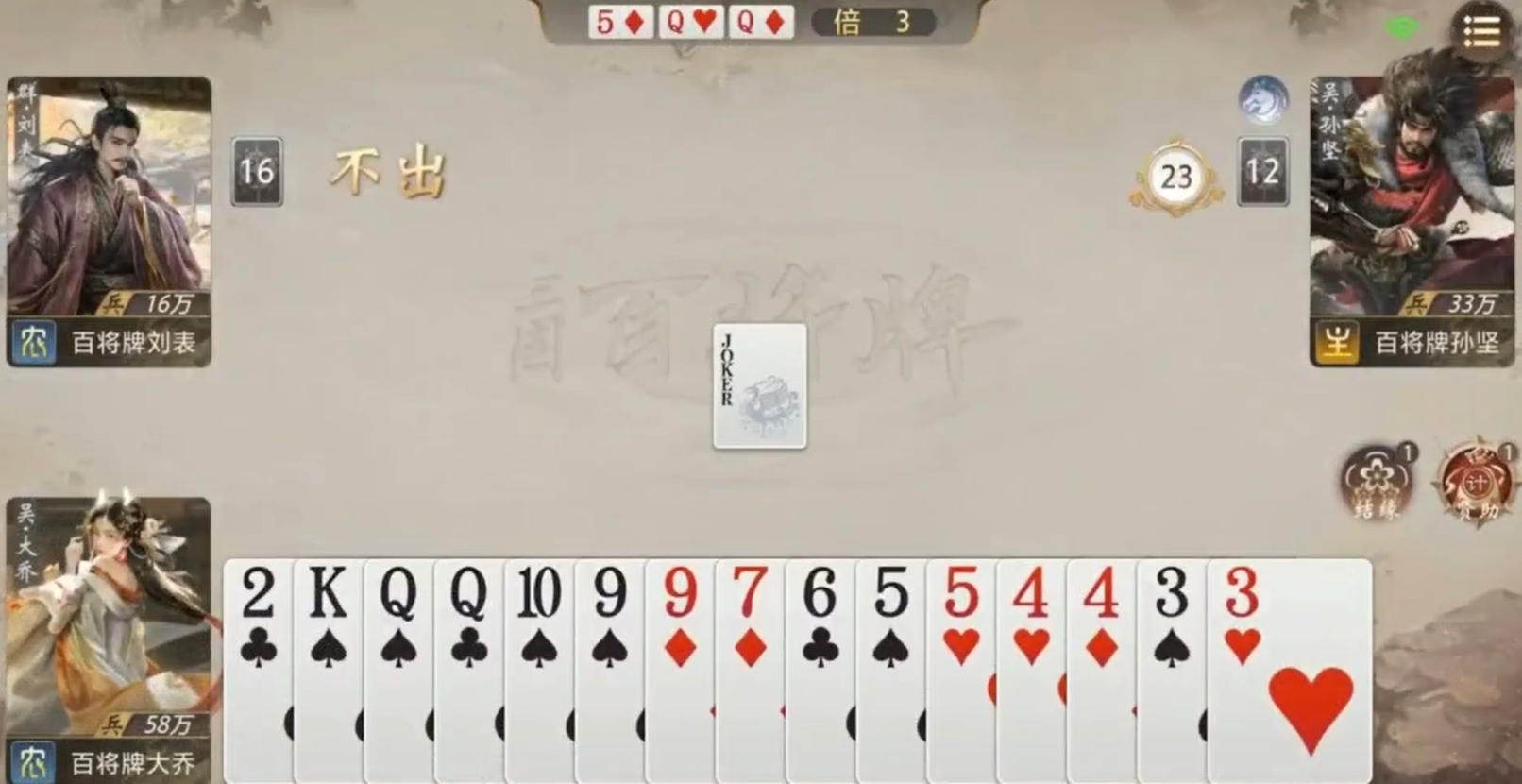身份差异显著影响大乔的操作重心:当地主时,应优先利用【结缘】回收零散高牌,配合【贤助】稳定获取2或A,将炸弹数量提升至4张以上,构建决胜压制组合;作为农民队友,需尽快打出大小王,加速大乔完成牌库整合与补牌循环,从而提升团队技能触发频率;若为反贼,则须预留王牌应对突发压制,同时在对子、顺子、三带等常见出牌结构中压缩技能收益区间,限制其资源转化效率。