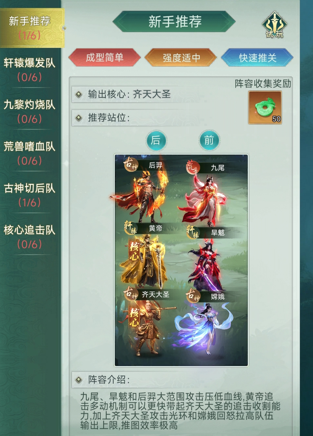 在主流阵容搭配方案中,“齐天大圣、嫦娥、伏羲、平天大圣、玄女”组成的五古神阵容适配性最佳。该阵容能激活【六合至尊】专属羁绊效果,为全体成员带来全属性增益,进一步增强后羿的持续输出能力与生存容错空间。