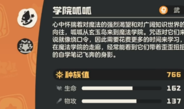 学院呱呱遵循均衡导向的三维成长框架,生命值、物理攻击与魔法攻击这三项基础数值均位列同阶精灵中的佼佼者,使其能够灵活应对多样化的对战环境。防御端的表现尤为亮眼,物理防御与魔法抗性始终保持在高水准,可从容抵御各类常见伤害。其专属被动技能“留学生”具备清晰的能量管控规则:每次启动需消耗2点能量,这促使玩家必须提前规划技能释放顺序与回合节奏,大幅增强了战术决策的重要性。