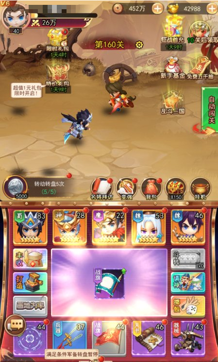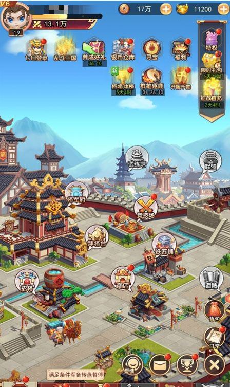 游戏开局即解锁征战与转盘两大核心系统。转盘机制作为资源导向型养成的重要入口,玩家可通过消耗金币或银币获得转动次数,随机获取武将碎片、兵器图纸、战棋残卷、天书秘籍等核心培养材料,还有机会触发特殊事件,例如额外经验加成、限时双倍掉落等。
