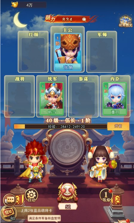 鼓台系统则构成了另一条独立的战力补充路径。玩家通过使用鼓槌击鼓,可在红颜、主公、军师、战将等共7个专属位置部署辅助型武将。这些角色不参与主线推图或PVP竞技,唯一作用是为玩家主战阵容提供稳定的属性加成,属于典型的“幕后支援型”养成体系。