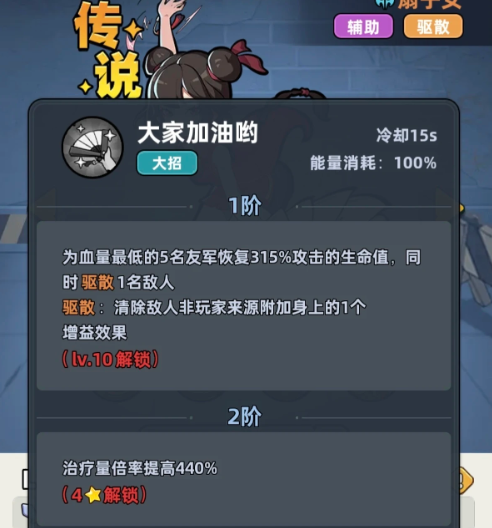 其核心机制体现在大招"清风回溯"上:十级解锁后,冷却时间为15秒,需要消耗全部能量。一阶效果能够为当前血量最低的5名友方单位恢复相当于自身攻击力315%的生命值,同时驱散1名敌方单位的增益状态。这种净化能力构成了她的差异化优势,在面对携带护盾、吸血、攻速提升等Buff的Boss时具有不可替代的作用。随着技能等级提升,治疗倍率最高可达到440%攻击。被动技能"鼓舞之力"进一步加强了保护机制:释放大招时,治疗量提升10%;同时为生命值低于50%的队友附加等同于自身攻击力100%的护盾。