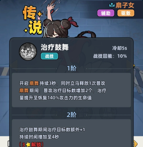 扇子女的基础成长表现稳定,达到满级60时属性为:防御105、攻击421、生命值9479。结合幸存者与职业双重特性后,获得全类型伤害减免10%的加成,同时格挡率也提升10%。这一特性显著增强了她的生存能力,使其无需依赖前排站位就能稳定地在后排提供治疗支持。主动技能"治疗鼓舞"冷却时间仅5秒,每次释放能为队友恢复10%能量,并且随着技能等级的提升,治疗目标数量会逐渐增加——第二、三阶段分别扩大治疗范围,确保多个单位都能获得持续的治疗效果。