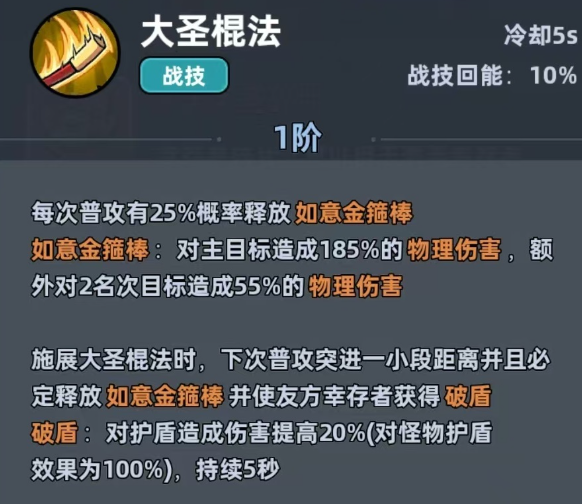 主动技能“大圣棍法”拥有5秒基础冷却时间,普攻触发概率为25%,命中主目标时造成185%物理伤害,并额外波及两个相邻单位,具备优秀的AOE清场能力。释放该技能后,下次普攻将附带短距离突进效果,并再次激活金箍棒机制;同时为全体友方施加“破盾”增益,使全队对护盾类目标的伤害提升至200%。当技能升至二阶后,若单次普攻未触发金箍棒,则下一次触发概率提升25%,显著增强机制触发的稳定性。