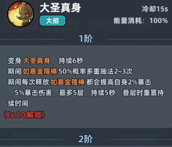 终极技能“大圣真身”于角色10级时解锁,初始冷却时间为15秒,持续6秒。在此期间,金箍棒触发概率提升至50%;升至二阶后,可增加多重施法次数。每次成功触发金箍棒,均可叠加2%暴击率与5%暴击伤害,最高叠加5层;叠层行为将重置技能持续时间,形成越战越强的正向循环。因此,暴击相关属性(暴击率、暴击伤害、暴击效果)应始终作为装备词条、符文搭配与资源分配的绝对优先级。升星带来的专属暴击加成,是快速建立压制优势的关键节点。