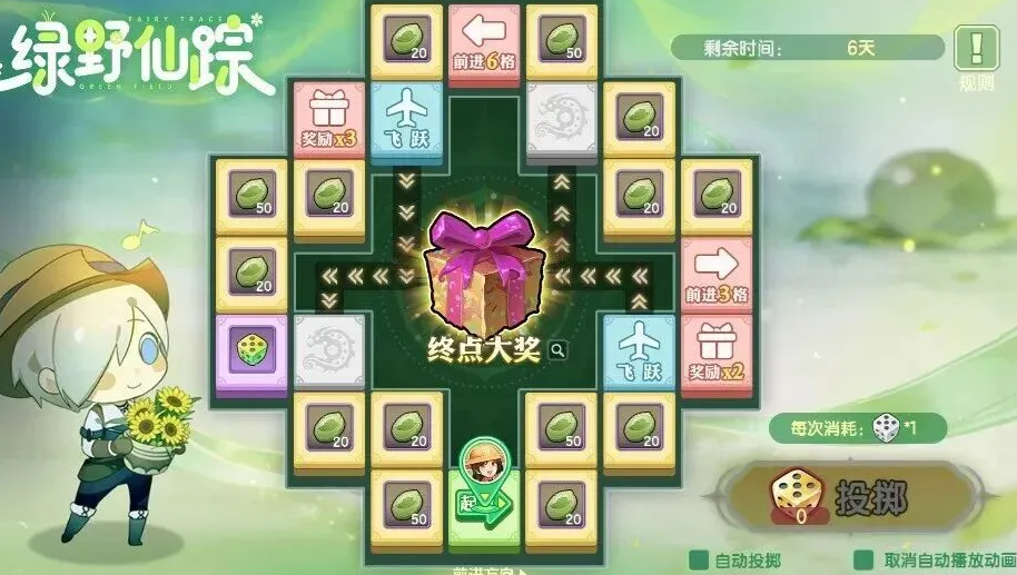 "绿野仙踪"为策略性行棋玩法,需消耗踏青骰子推进角色前进。地图包含常规积分格与特殊事件格,每步均可获得不等量踏青积分;抵达终点固定奖励200点积分,部分特殊格子额外提供限定外观、限时称号或稀有材料。