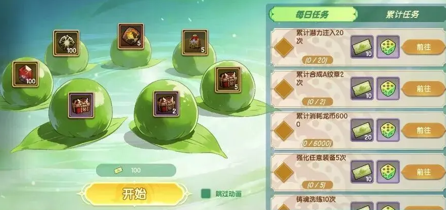 "春日辛勤"为第二核心模块,侧重任务驱动型奖励获取。玩家达成指定目标后将获得踏青骰子与活动奖券两类道具。其中奖券可用于开启限定抽奖池,奖池内含全材料自选包、强化石、潜能原石、金币包等高价值成长物资,保底机制确保必得稀有资源。