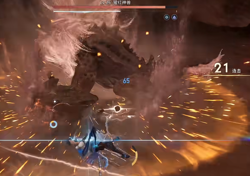 以"猩红神兽"为例,该Boss存在明显的破绽时机:当玩家持续攻击其尾部区域约3秒后,Boss会俯身蓄力并向下喷发熔岩柱,此时地面会出现明显的红色预警光圈。需在光圈完全扩散前使用闪避,成功触发闪光状态即进入短暂无敌期,期间可立即接续二段黄金回旋贴近并爆发输出,全程不损失血量且连击不断。