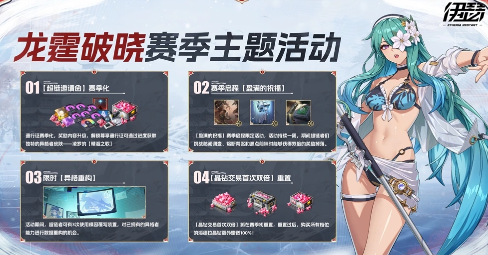 赛季通行证完成全面赛季化改造,奖励结构大幅扩充。解锁尊享通行证后,玩家可通过进度累积获得异格者皮肤"凌罗的晴海之歌"。同期开启的"赛季启程"活动为期七日,在熔断禁区、源点前哨及秘闻调查副本中,掉落奖励翻倍。限时活动"异格重构"提供三次模因覆写装置使用机会,支持对已拥有异格者的能力数据进行定向重构,提升角色适配度与策略深度。